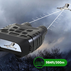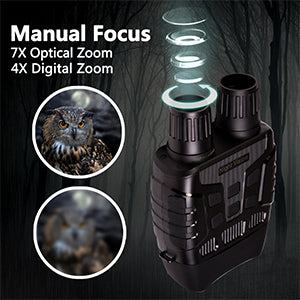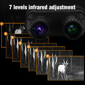LONG DISTANCE VIEWING RANGE: With outstanding optical clarity, this night vision binoculars for adults enable you to observe targets quickly in total darkness and the range up to 984ft/300m. 7 IR illumination levels are easily switchable while viewing. Buttons are readily accessible by fingers of both hands while holding the unit. Manual focus via left lens is straightforward - quickly adjust to get crisp image or video.