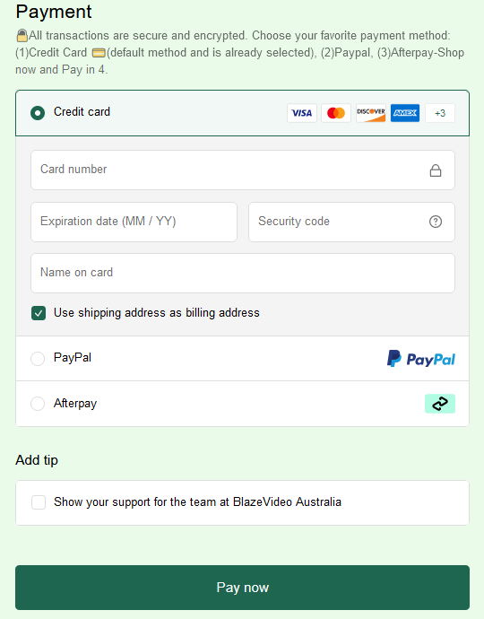 Currently, https://au.blazevideo.net/ supports 3 payment methods: 1.PayPal, 2.Credit/Debit Card, 3.Afterpay. Detailed processes are as follows: